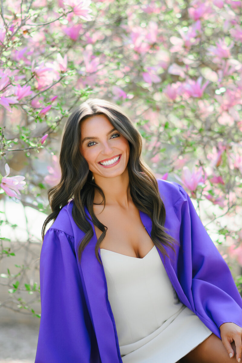 College gear is a great way to celebrate your next chapter, but instead of a basic t-shirt, I suggest choosing outfits that feel like a fun, elevated version of a college game day look. Wear colors that match your school and think stylish layers, skirts, jeans, or accessories that give a spirited yet polished vibe. For cap-and-gown photos, choose a well-fitted outfit underneath—like a dress, jumpsuit, or dress pants with a nice top—so the look is complete when the gown comes off. We will capture a mix of timeless portraits and fun, celebratory shots, from classic smiling poses to tossing your cap in the air.